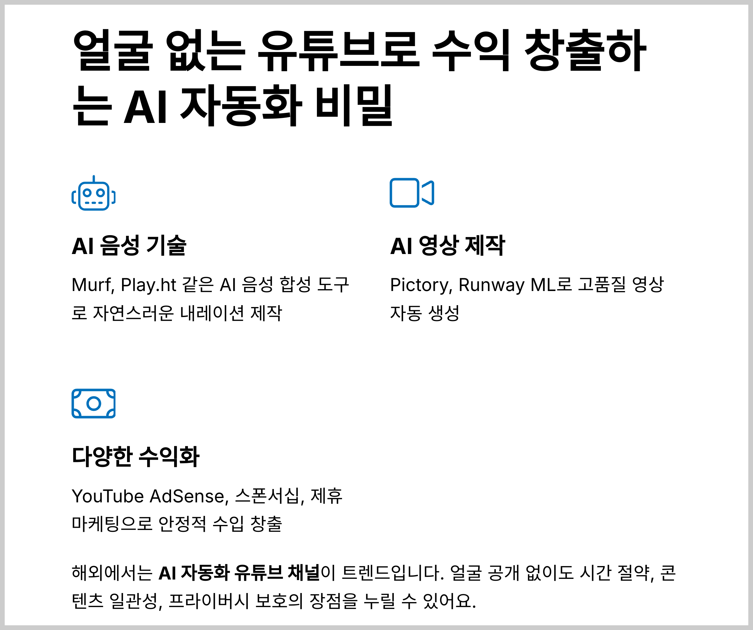 ➡ 얼굴을 공개하지 않고 AI 음성 및 자동화 편집 툴(Pictory, Runway ML 등)을 활용하여 정보 제공, 리뷰 콘텐츠를 제작하고 유튜브 광고 및 협찬을 통해 수익을 창출하는 방식입니다.