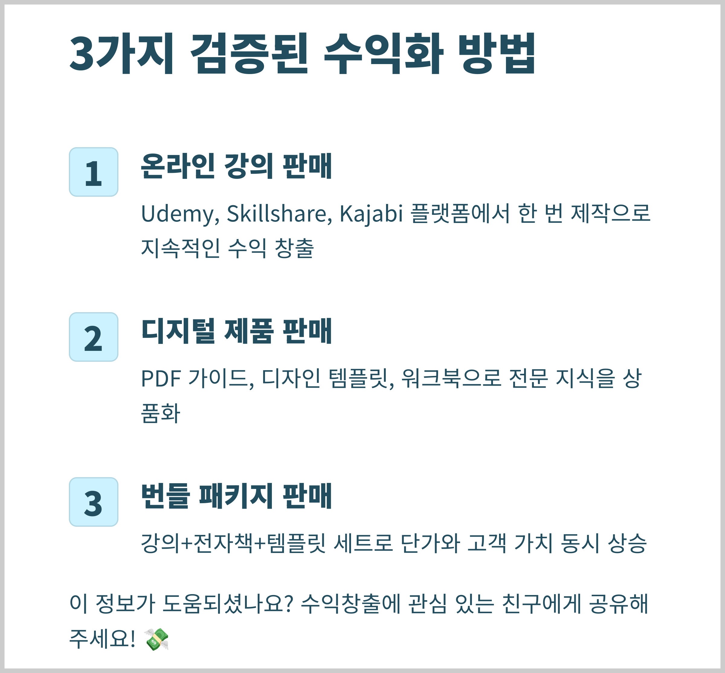 - 디지털 제품 결합: 강의 + PDF 가이드북 + 템플릿을 패키지로 판매